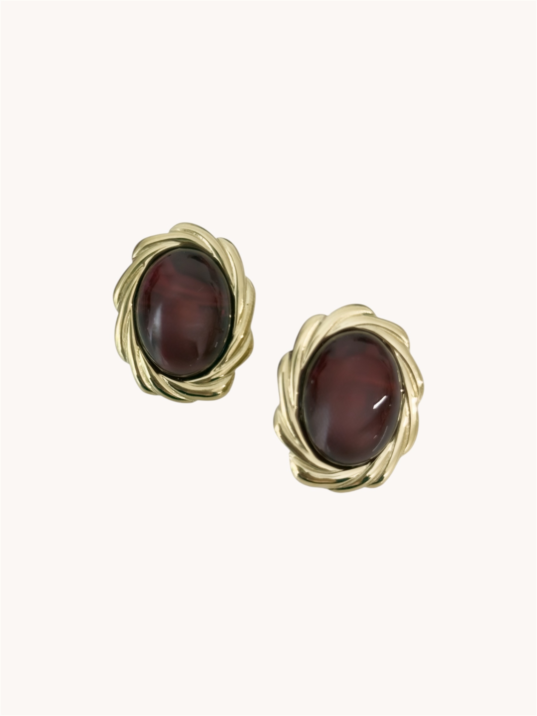 Σκουλαρίκια από ατσάλι σε χρυσό χρώμα με λεπτομέρεια από πέτρα σε μπορντό χρώμα.