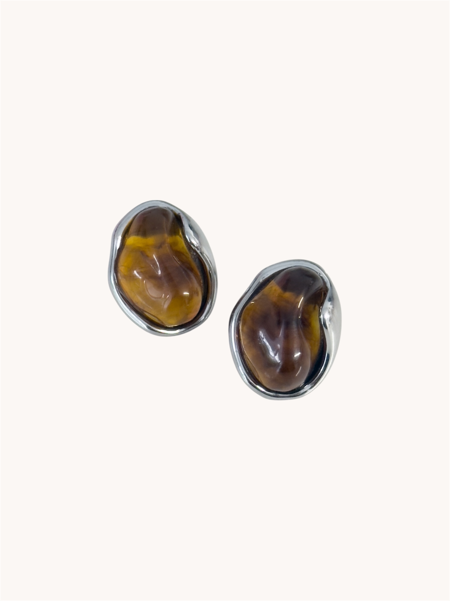 Σκουλαρίκια από ατσάλι σε ασημί χρώμα με καφέ πέτρα.